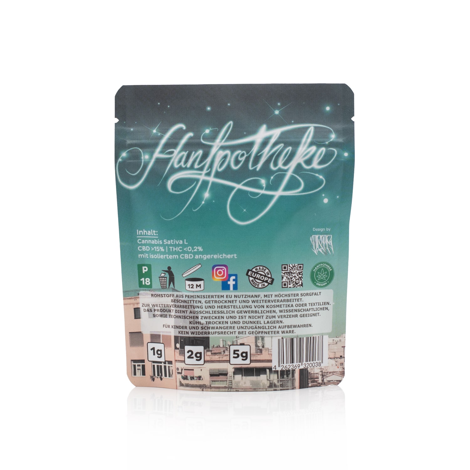 Amnesia Haze wurden aus EU zertifizierten Nutzhanfsorten gewonnen und weisen einen CBD Gehalt von über 15% auf. Die mittelgroßen festen Blüten sind dank 2-Way-Humidity-Pack von Boveda perfekt im Doypack geschützt.